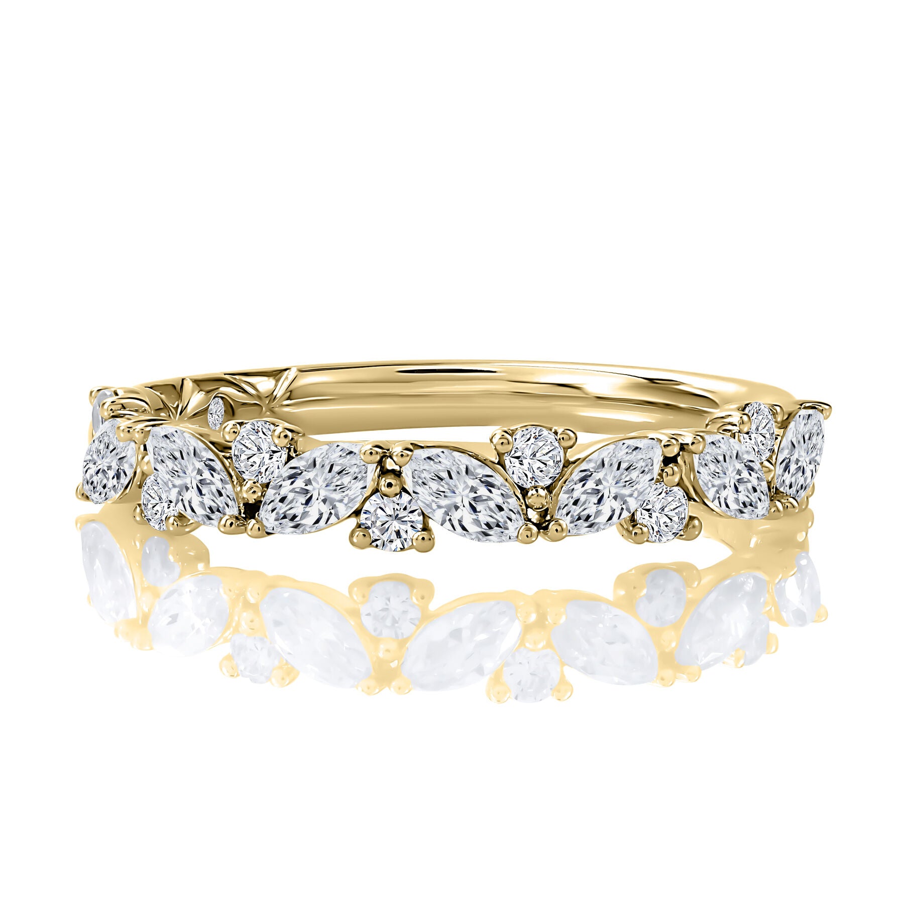 The Unique Scattered Round and Marquise Halfway Diamond Band showcases a captivating mix of round and marquise-shaped diamonds, artfully scattered across the band for a dynamic, modern effect. Each stone is set with precision. (0.74ctw, G, SI, 14ky, size 6)