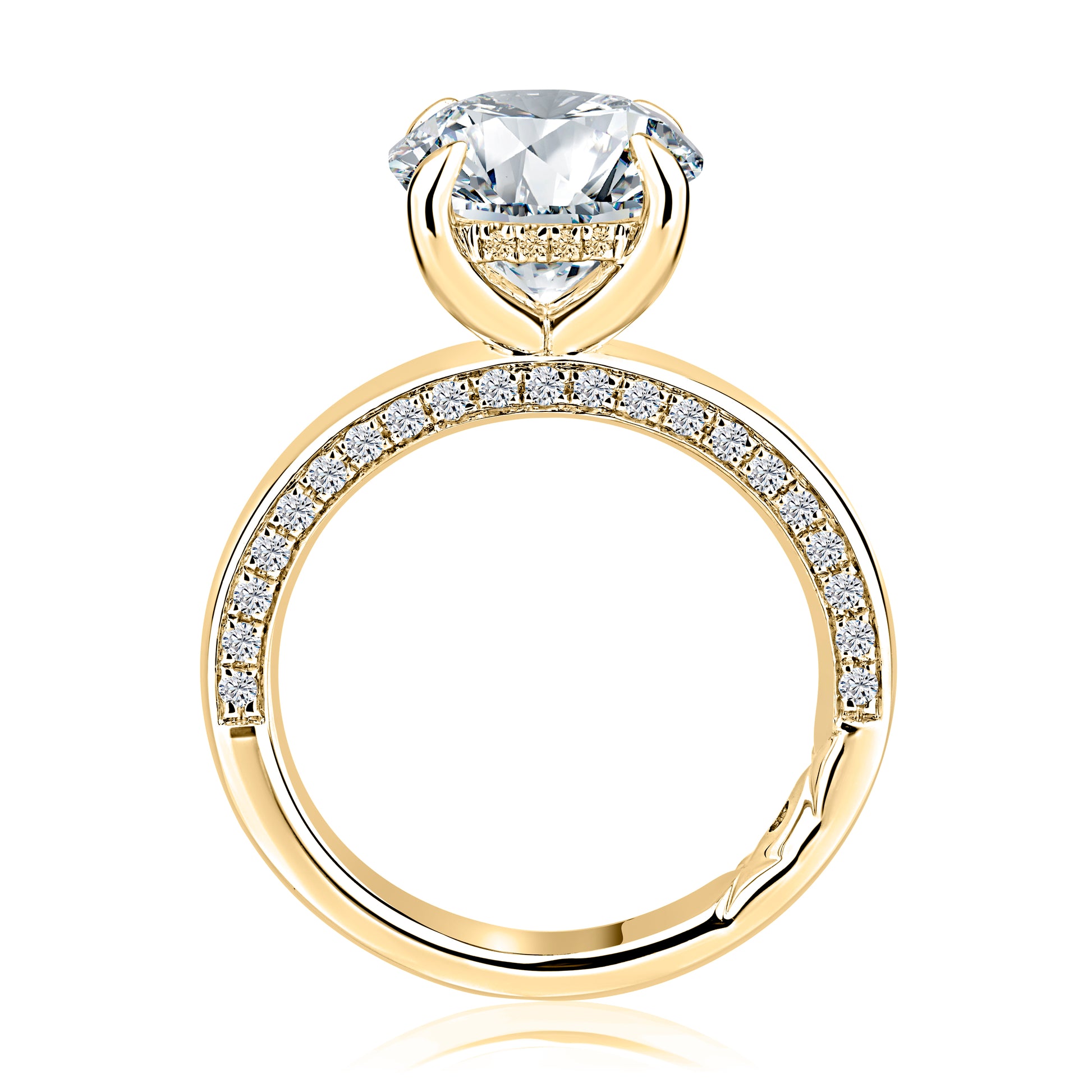 With 0.38ctw of diamonds (G/SI) pave set into the side of the ring shank, this stunning A Jaffe Solitaire Diamond Engagement Ring is an instant classic. In stock in 14k yellow gold, size 6, with a 4-prong, peg-head setting for a 2ct round brilliant cut center stone (sold separately).